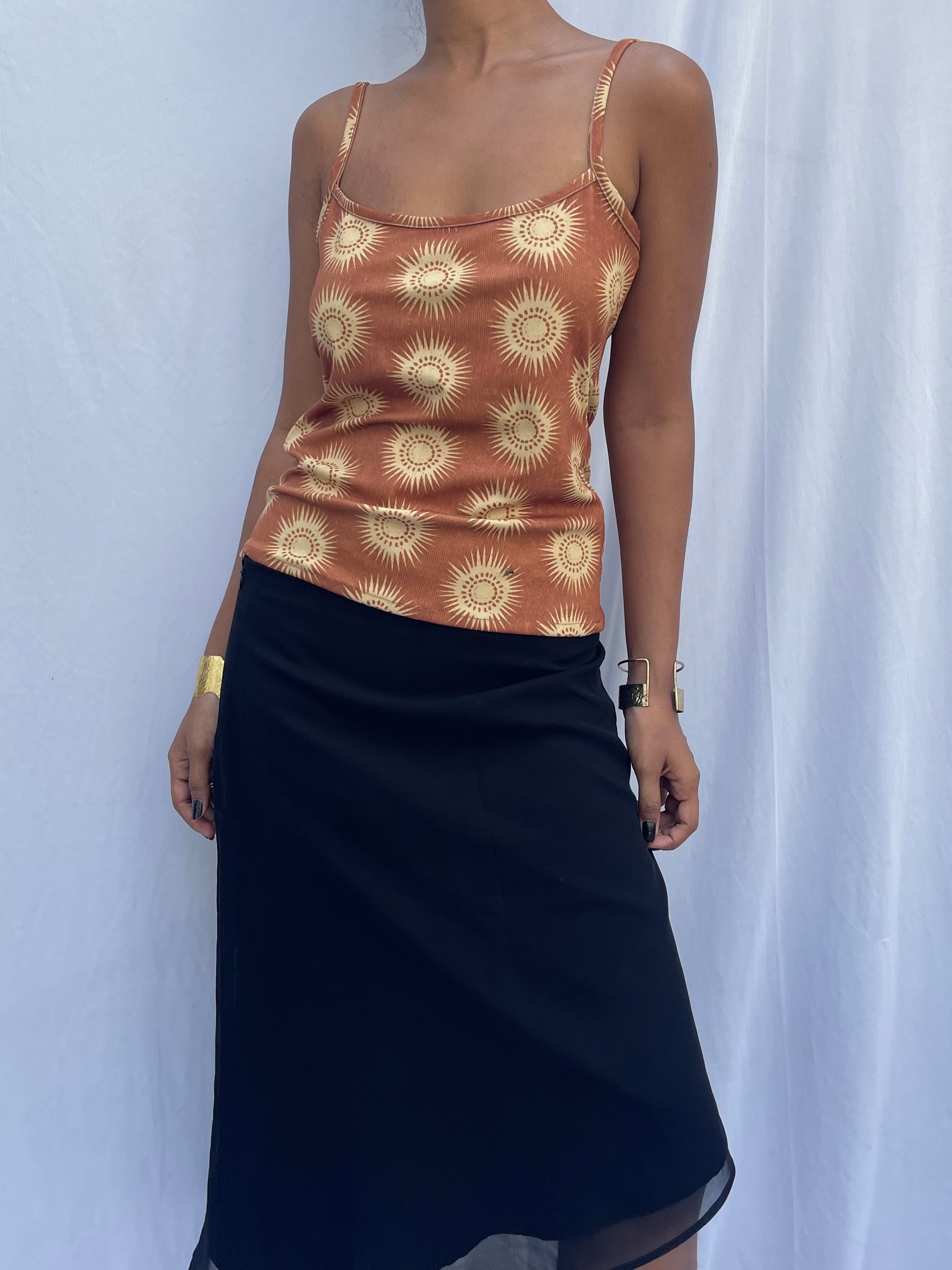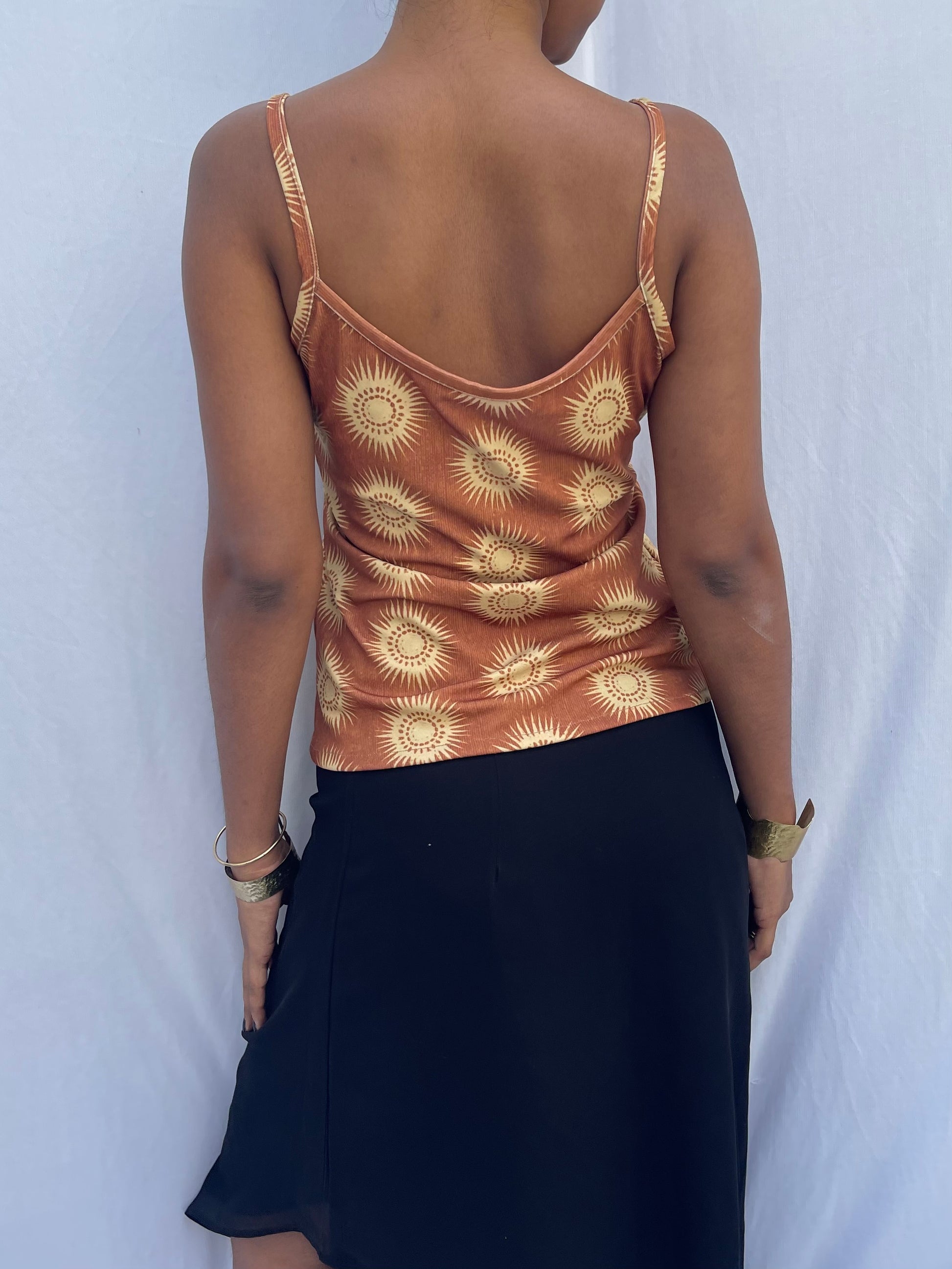 Sunny slip top features a spaghetti slip style top with a unique sun print.